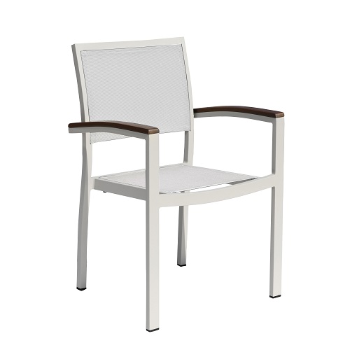 De terrasstoel is uitgevoerd met taupe textileen op de zitting en rug, een taupe aluminium frame en teak hout op de armleuningen. De Heck is een weer- en UV-bestendig en gemakkelijk in onderhoud en reiniging.