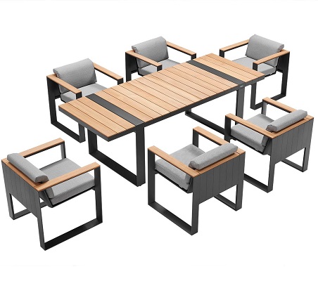 Deze diningset bestaat uit zes comfortabele terrasstoelen en een dinertafel met teakhouten blad in lattenstructuur. Deze luxe outdoor meubelstukken zijn voorzien van een antraciet gepoedercoat aluminium frame. Door deze materiaalkeuze is het frame licht van gewicht, maar zeer stevig. De poedercoating zorgt er tevens voor dat het frame krasvast en onderhoudsarm is. Zowel het tafelblad als de details op de armleuningen zijn van een warm teakhout. In de terrasstoelen zijn dikke grijze 100% Acryl kussens geplaatst. Acryl is een sterk, vuilafstotend en UV-bestendig materiaal. De kussens zijn hierdoor slijtvast en voelen heerlijk zacht aan! De Cambusa Diningset is perfect geschikt voor professioneel buitengebruik.