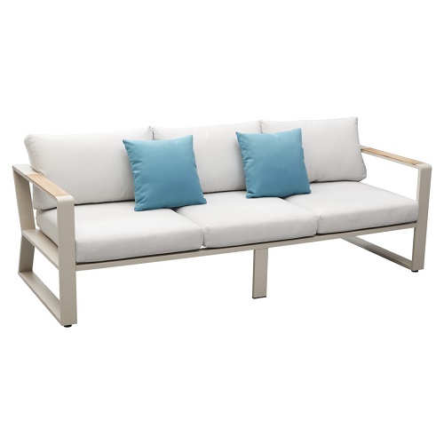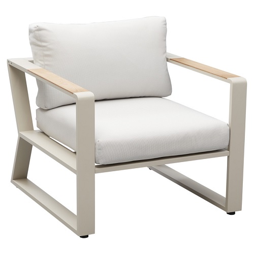 Deze loungeset bestaat uit een loungebank (tweezits), twee loungestoelen en een stijlvolle koffietafel. Deze stijlvolle outdoor meubelstukken zijn voorzien van een taupekleurig gepoedercoat aluminium frame. Door deze materiaalkeuze is het frame licht van gewicht, maar zeer stevig. De poedercoating zorgt er tevens voor dat het frame krasvast en onderhoudsarm is. Zowel het tafelblad als de details op de armleuningen zijn van een teakhout. In de loungebank- en stoelen zijn dikke witte Olefin kussens geplaatst. Olefin is een sterk, vuilafstotend en UV-bestendig materiaal. De kussens zijn hierdoor slijtvast en voelen lekker zacht aan! De Exee Loungeset is dan ook geschikt voor professioneel buitengebruik.