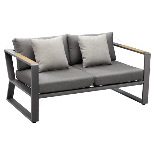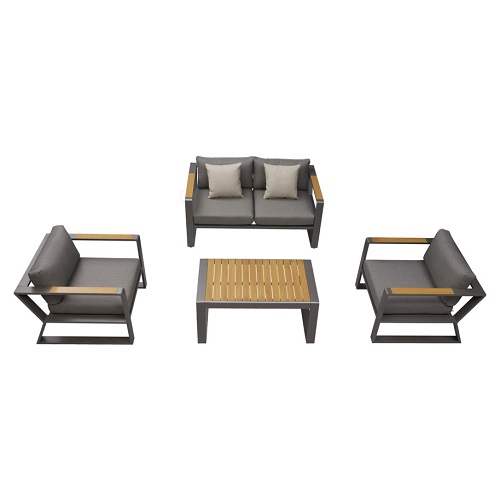 Deze loungeset bestaat uit een loungebank (tweezits), twee loungestoelen en een stijlvolle koffietafel. Deze stijlvolle outdoor meubelstukken zijn voorzien van een zwartkleurig gepoedercoat aluminium frame. Door deze materiaalkeuze is het frame licht van gewicht, maar zeer stevig. De poedercoating zorgt er tevens voor dat het frame krasvast en onderhoudsarm is. Zowel het tafelblad als de details op de armleuningen zijn van een teakhout. In de loungebank- en stoelen zijn dikke grijze Olefin kussens geplaatst. Olefin is een sterk, vuilafstotend en UV-bestendig materiaal. De kussens zijn hierdoor slijtvast en voelen lekker zacht aan! De Exee Loungeset is dan ook geschikt voor professioneel buitengebruik.