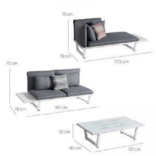 De Sophia loungeset bestaat uit: 1 bankelement (links), 1 bankelement (rechts) en een koffietafel (80 x 120 cm).
