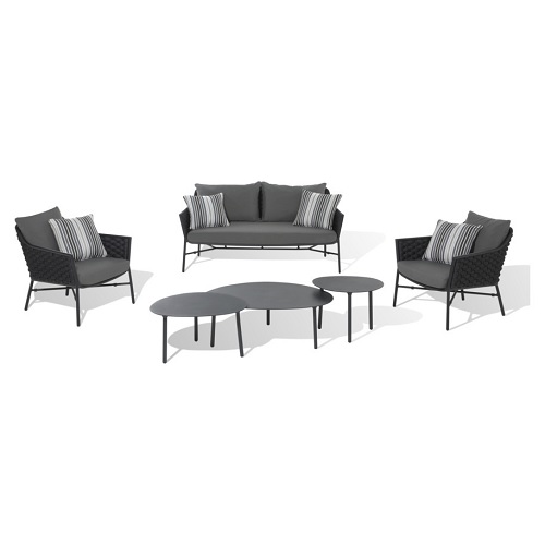 De Rio Loungeset heeft een trendy uitstraling door het zwarte vlechtwerk. Het moderne design zorgt in combinatie met de bijgeleverde kussens voor ultiem zitcomfort! Deze loungeset is van horecakwaliteit en gaat dan ook jaren mee! De set wordt inclusief bijpassende koffietafeltjes geleverd.