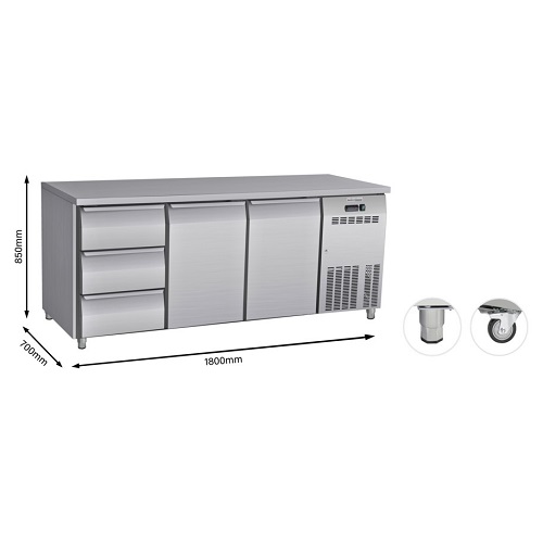 - Verstelbare voetjes om de koelwerkbank op de gewenste werkhoogte te zetten (minimale H: 83,7 cm, maximale H: 86 cm).
