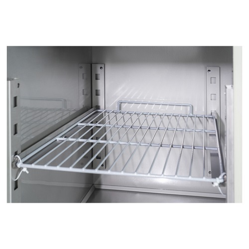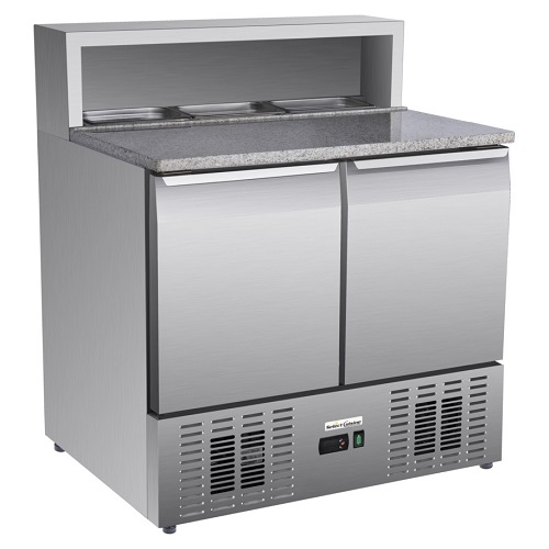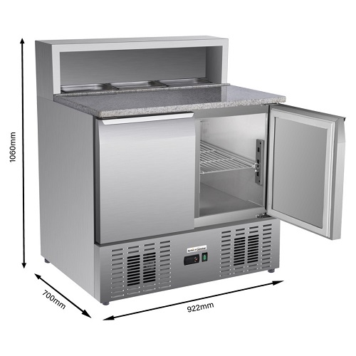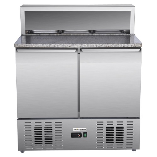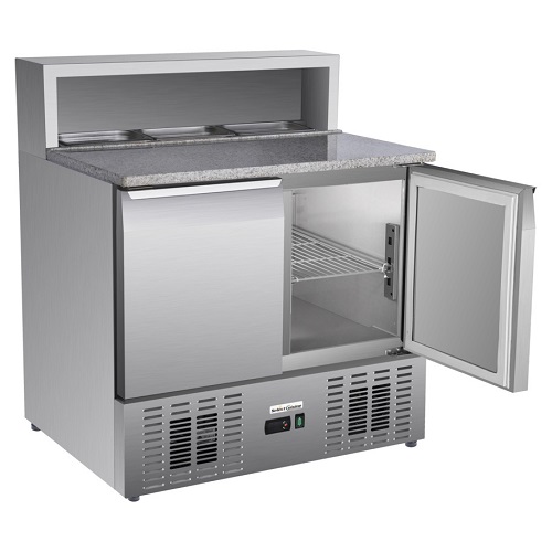 De saladette PS900 van Select Cuisine heeft 2 deuren en een inhoud van 215 liter. Deze mooie saladette heeft een marmeren werkblad, wat ideaal is voor het bereiden van diverse etenswaren. Het model heeft een temperatuurbereik van 2°C tot 8°C en is voorzien van een slot. De saladette is gemaakt van luxe roestvrij staal wat ook eenvoudig te reinigen is. In de saladette zitten 2 roosters, welke verstelbaar zijn. Het werkblad biedt ruimte voor bakken met GN 1/4 formaat. Let op, de saladette wordt geleverd zonder gastronorm bakken.
