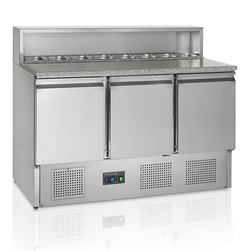 De Tefcold pizzawerkbank PT930 is een koelwerkbank speciaal voor pizza. De pizzawerkbank is voorzien van een granieten werkblad. De koelwerkbank beschikt over een geventileerde koeling en een automatische ontdooiing. De Tefcold pizzawerkbank PT930 heeft 3 deuren en een capaciteit van 3x 1/1GN. De temperatuur is in te stellen van +2˚C tot +10˚C.