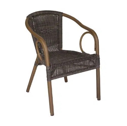 De Costa terrasstoel is voorzien van een woodlook aluminium frame en rond vlechtwerk in de kleur donkerbruin (Coffee), maar is ook verkrijgbaar in de kleuren Zwart, Mocca en Naturel.